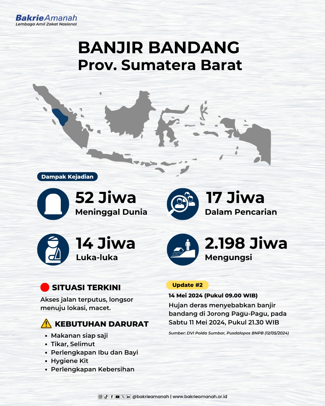 Tercatat hingga 14 Mei 2024 terdapat 52 jiwa korban meninggal dunia dan 17 jiwa masih dalam pencairan serta 14 luka - luka dan 2.198 jiwa mengungsi.